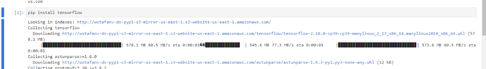 This allows users to install Python packages that have been provisioned into the repository with standard pip install <package_name> commands from JupyterLab notebooks: