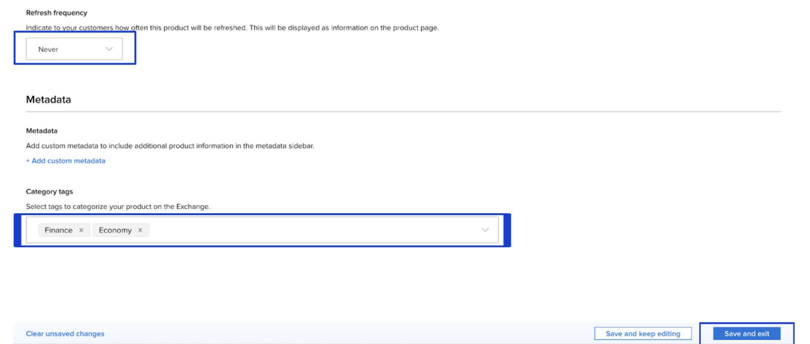 Add your Refresh Frequency so your consumers know how often (if at all) your product will update, and Category Tags (like Finance or Technology) so buyers can find you on the Exchange.