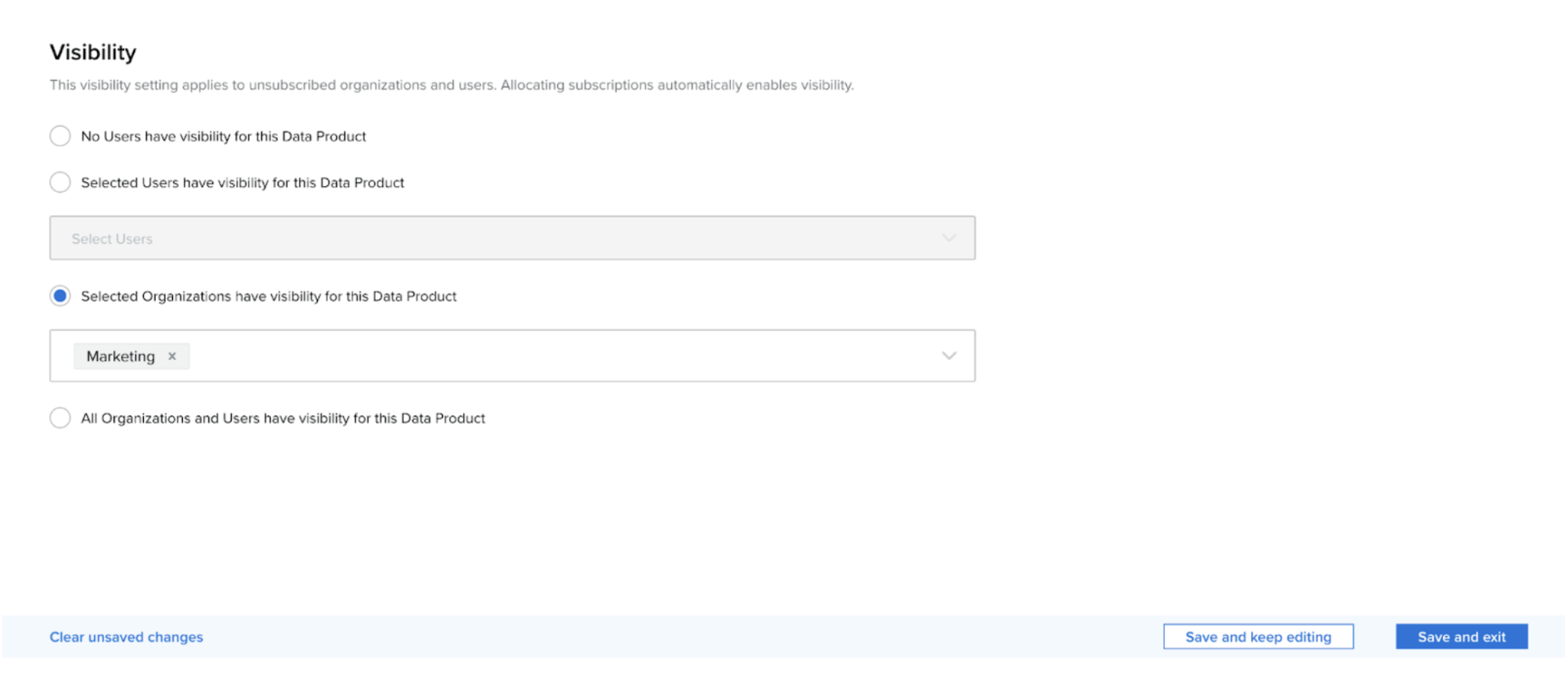 Choose to make the product visible to All organizations, specific Selected organizations, or keep it restricted to Selected users.