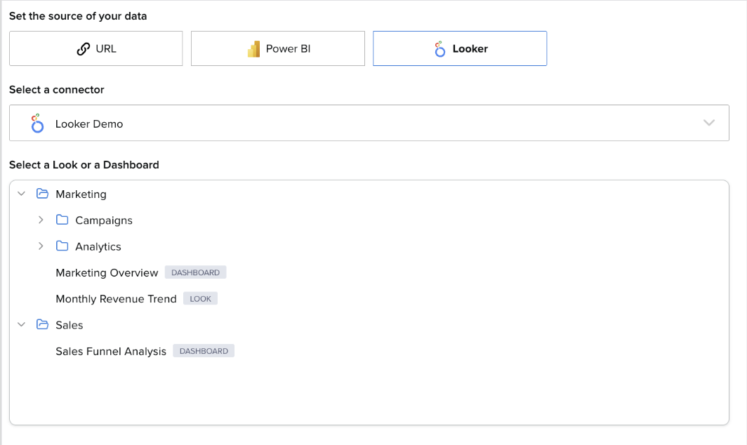 The Looker connector allows you to integrate Looker Explores, Looks, and Dashboards into the platform using API credentials. Once connected, these visualizations can be surfaced as assets that are fully embedded and viewable directly within the platform.