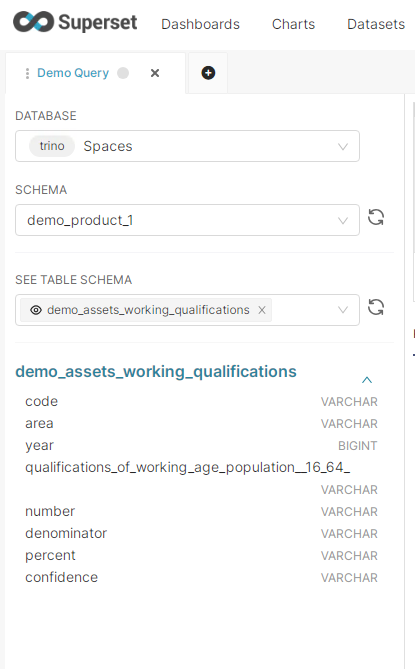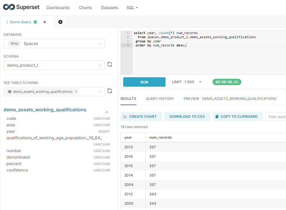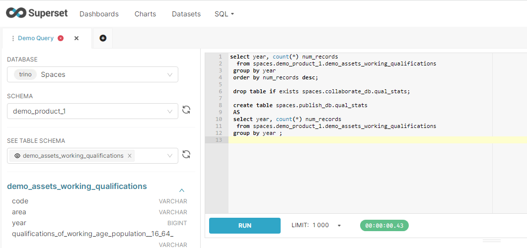 In Spaces, SQL is executed via the Trino query engine, optimised for Fast Query performance, exploration and analytics, and querying at-source Assets added to a Space.